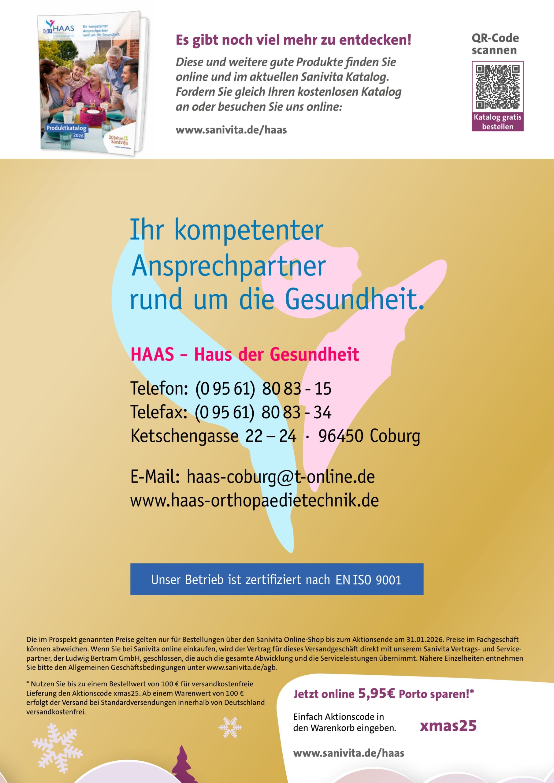 Ketschengasse 22–24, 96450 Coburg | Orthopädietechnik: 09561-80830 / Sanitätshaus: 09561-808315 | haas-coburg@t-online.de